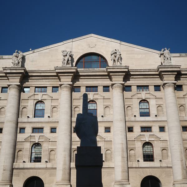 Il tour passa anche per Palazzo Mezzanotte, imponente e severo, simbolo della monumentalità del fascismo. Ma davanti all’ingresso, un colpo d’occhio sorprendente: L.O.V.E., ironico e provocatorio.